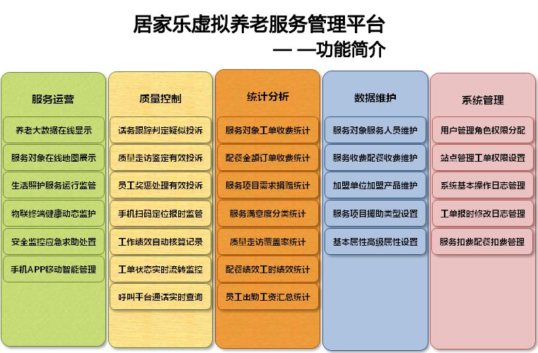目前的居家乐智能云平台能够实现服务商高效运行、客户方亲情体验、第三方有效监督。其涵盖基于生活照护计划的服务运行监管系统;基于智能物联终端的健康动态监护系统;基于生活产品选择的配送业务运营系统;基于安全监控终端的紧急救助处置系统;基于系统业务数据的智能综合分析系统;基于智能手机APP的移动养老管理终端,基于微信公众API的养老信息发布系统和基于多源信息融合的养老服务门户网站。智能云平台的有效运行为居家乐规模化、连锁化发展提供了核心竞争力。